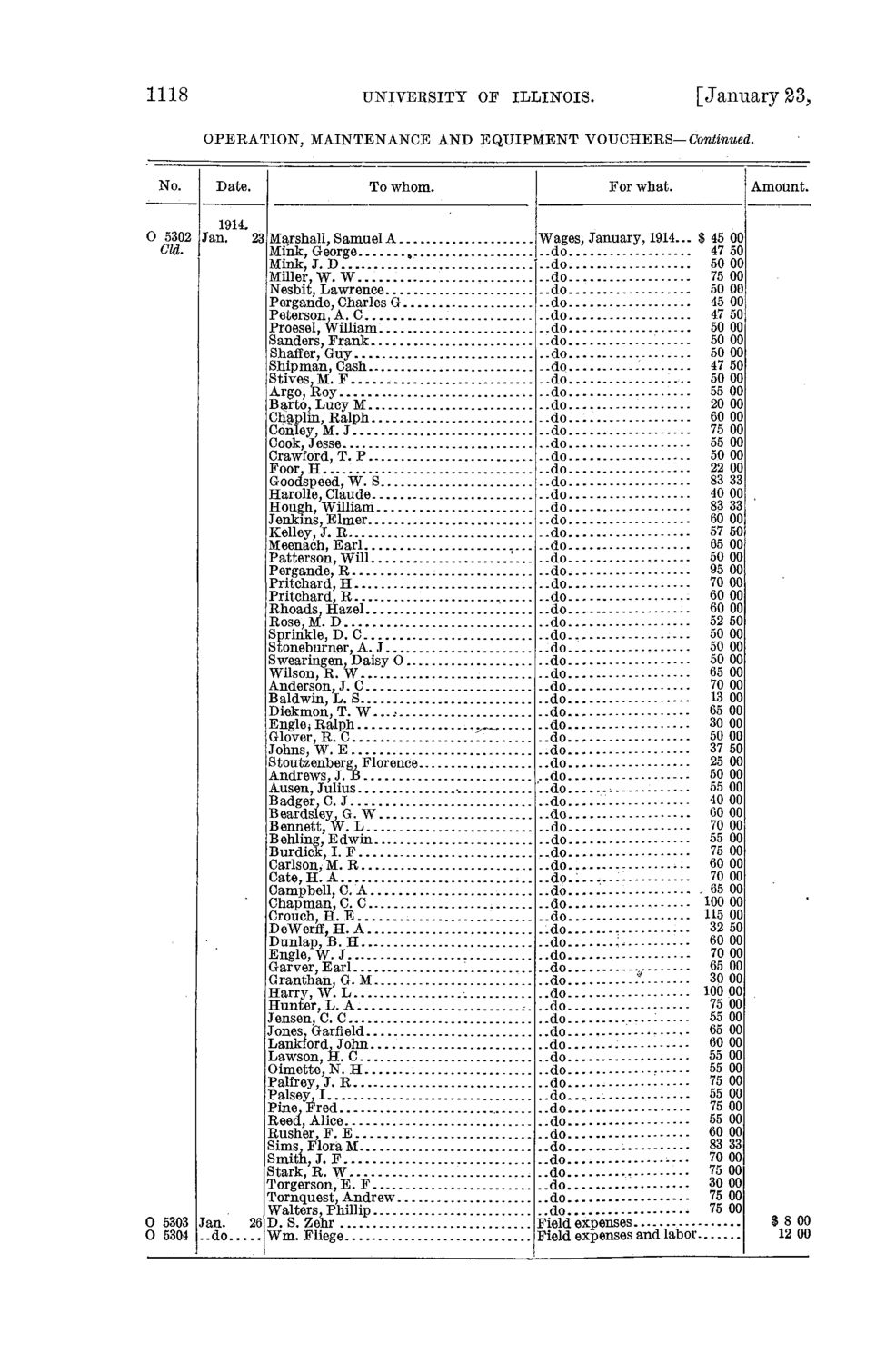 1118 UNIVERSITY OF ILLINOIS. [January 23> OPERATION, MAINTENANCE AND EQUIPMENT VOUCHERS— Continued. No. Date. To whom. For what. Amount. 1914. 0 5302 Jan. 23 Marshall, Samuel A Cld. Mink, George Mink, J. D ,'... , Miller, W. W . . . . . . Nesbit, Lawrence Pergande, Charles G Peterson, A. C Proesel, W illiam Sanders, Frank Shaffer, Guy Shipman, Cash Stives, M. F Argo, Roy Barto, Lucy M Chaplin, Ralph Conley, M. J Cook, Jesse Crawford, T. P Foor, H Goodspeed, W. S Harolle, Claude Hough, William Jenkins, Elm^r. r ... u Kelley, J. R . . . . Meenach, Earl Patterson, Will Pergande, R Pritchard, H Pritchard, R Rhoads, Hazel Rose, M. D Sprinkle, D. C Stoneburner, A. J S wearingen, Daisy 0 Wilson, R. W Anderson, J. C Baldwin, L. S Diekmon, T. W . . . * Englej Ralph .^^, Glover, R. C .. Johns, w " R Stoutzenberg, Florence Andrews, J. B Ausen, Julius • Badger, C. J Beardsley, G. W Bennett, W. L Behling,' Edwin.,Burdick, I. F Carlson, M. R Cate, H. A Campbell, C. A Chapman, C. C Crouch, H. E DeWerff, H. A . Dunlap, B. H .. Engle, W. J Garver, Earl Granthan, G. M. Harry, W. L Hunter, L. A Jensen, C. C Jones, Garfield Tvankfnrd, John .... Lawson, H. C Oimette, N. H . Palfrey, J. R Palsey, I Pine, Fred Reed, Alice Rusher, F . E Sims, Flora M Smith, J. F Stark, R. W Torgerson, E. F . .. Tornquest, Andrew Walters, Phillip 0 5303 Jan. 26 D. S. Zehr 0 5304 ..do .. . Wm. Fliege |..do ..do ..do... ..do ..do ..do ..do ..do ..do ..do ..do ..do ..do.... ..do ..do ..do ..do ..do ..do ..do ..do ..do ..do ..do ..do. ..do ..do ..do ..do ..do ..do ..do ..do ..do ..do ..do ..do ..do ..do ..do ..do Wages, January, 1914... $ 45 00 47 50 50 00 75 00 50 00 45 00 47 50 50 00 50 00 '. 50 00 47 50 50 00 55 00 20 00 60 00 75 00 55 00 50 00 22 00 83 33 40 00 83 33 60 00 57 50 65 00 50 00 95 00 70 00 - 60 00 60 00 -- 52 50 --.. 50 00 50 00 50 00 65 00 70 00 13 00 65 00 30 00 50 00 37 50 25 00 50 00 55 00 40 00 ..do '.' 60 00 ..do 70 00 do 55 00 .do 75 00 ..do 60 00 ..do -- 70 00 ..do....--.-. 65 00 ..do......--100 00 ..do 115 00 ..do 32 50 .do --- 60 00 70 00 .do.. :. 65 00 .do 30 00 100 00 do ......*. 75 00 do 55 00 do 65 00 do 60 00 55 00 do -. 55 00 do 75 00 55 00 75 00 .do 55 00 60 00 83 33 70 00 75 00 do --- 30 00 75 00 75 00 $ 8 00 12 00 Field expenses and labor