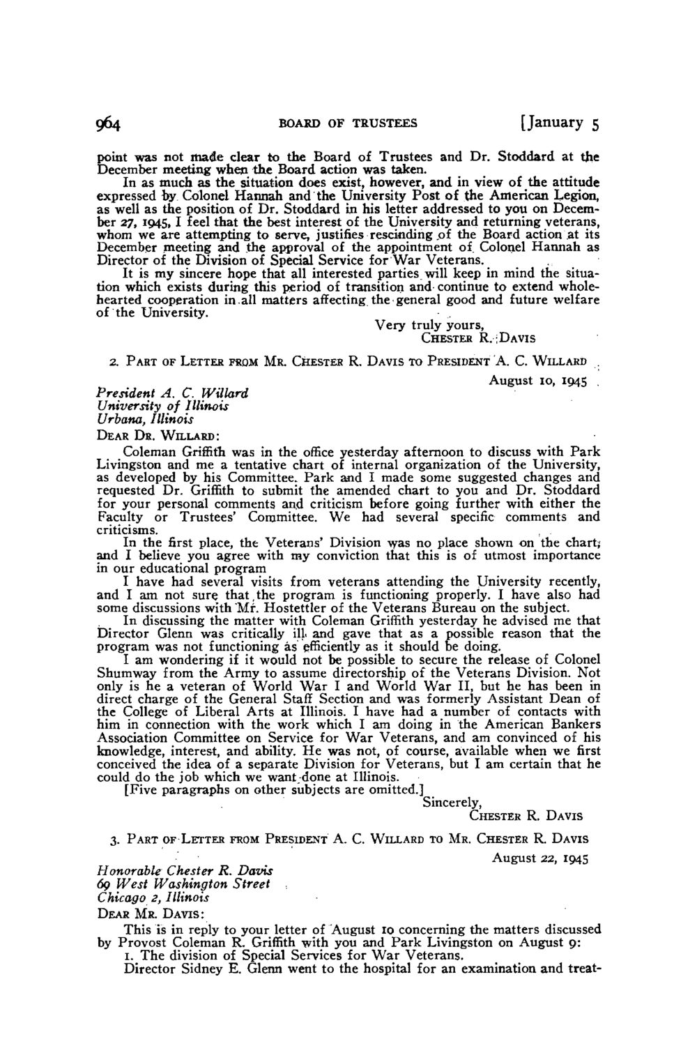 964 BOARD OF TRUSTEES [January 5 point was not m a d e clear to the Board of Trustees and Dr. Stoddard at the December meeting when the Board action was taken. In as much as t h e situation does exist, however, and in view of the attitude expressed by Colonel Hannah and the University P o s t of the American Legion, as well as the position of D r . Stoddard in his letter addressed to you on December 27, 1945,1 feel that the best interest of the University and returning veterans, whom we are attempting to serve, justifies rescinding .of the Board action a t its December meeting and the approval of the appointment of Colonel H a n n a h as Director of the Division of Special Service for W a r Veterans. It is my sincere hope that all interested parties will keep in mind the situation which exists during this period of transition and continue to extend wholehearted cooperation in.all matters affecting the general good and future welfare of the University. Very truly yours, CHESTER R . ; D A V I S 2. P A R T OF LETTER FROM M R . CHESTER R. D A V I S TO PRESIDENT A. C. WILLARD . August 10, 194s . President A. C. Willard University of Illinois Urbana, Illinois DEAR D R . W I L L A R D : Coleman Griffith was in the office yesterday afternoon to discuss with P a r k Livingston and me a tentative chart of internal organization of the University, as developed by his Committee. P a r k and I made some suggested changes and requested Dr. Griffith to submit the amended chart to you and Dr. Stoddard for your personal comments and criticism before going further with either the Faculty or Trustees' Committee. We had several specific comments and criticisms. In the first place, the Veterans' Division was no place shown on the chart; and I believe you agree with my conviction that this is of utmost importance in our educational program I have had several visits from veterans attending the University recently, and I am not sure t h a t , t h e program is functioning properly. I have also had some discussions with "Mr. Hostettler of the Veterans Bureau on the subject. In discussing the matter with Coleman Griffith yesterday he advised me that Director Glenn was critically ill. and gave that as a possible reason that the program was not functioning as efficiently as it should be doing. I am wondering if it would not be possible to secure the release of Colonel Shumway from the Army to assume directorship of the Veterans Division. Not only is he a veteran of World W a r I and W o r l d W a r II, but he has been in direct charge of the General Staff Section and was formerly Assistant Dean of the College of Liberal A r t s at Illinois. I have had a number of contacts with him in connection with the work which I am doing in the American Bankers Association Committee on Service for W a r Veterans, and am convinced of his knowledge, interest, and ability. H e was not, of course, available when we first conceived the idea of a separate Division for Veterans, but I am certain that he could do the job which we want .-done at Illinois. [Five paragraphs on other subjects are omitted.] Sincerely, CHESTER R. DAVIS 3. P A R T OF LETTER FROM PRESIDENT A. C. WILLARD TO M R . CHESTER R. D A V I S August 22, 1945 Honorable Chester R. Davis 60 West Washington Street Chicago 2, Illinois DEAR M R . D A V I S : This is in reply to your letter of August 10 concerning the matters discussed by Provost Coleman R. Griffith with you and P a r k Livingston on August 9: 1. T h e division of Special Services for W a r Veterans. Director Sidney E. Glenn went to the hospital for an examination and treat-