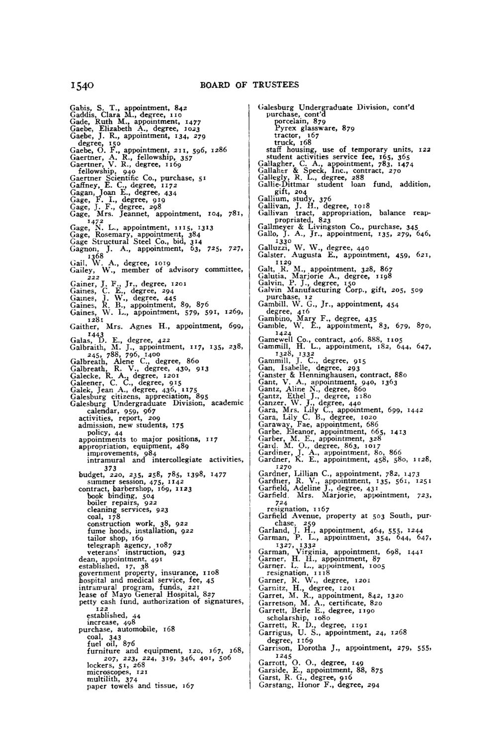 i54o BOARD OF TRUSTEES Galesburg Undergraduate Division, cont'd purchase, cont'd orcelain, 879 'yrex glassware, 879 tractor, 167 truck, 168 staff housing, use of temporary units, 122 student activities service fee, 165, 36s Gallagher, C. A., appointment, 783, 1474 Gallahtr & Speck, Inc., contract, 270 Gallegly, R. L., degree, 288 Gallie-Dittmar student loan fund, addition, gift, 204 Gallium, study, 376 Gallivan, J. H., degree, 1018 Gall i van tract, appropriation, balance re appropriated, 823 Gallmeyer & Livingston Co., purchase, 345 Gallo, J. A., Jr., appointment, 135, 279, 646, Gabis, S. T., appointment, 842 Gaddis, Clara M., degree, n o Gade, Ruth M., appointment, 1477 Gaebe, Elizabeth A., degree, 1023 Gaebe, J. R., appointment, 134, 279 degree, 150 Gaebe, O. F., appointment, 211, 596, 1286 Gaertner, A. R., fellowship, 357 Gaertner, V. R., degree, 1169 fellowship, 940 Gaertner Scientific Co., purchase, S 1 Gaffney, E. C , degree, 1172 Gagan, "Joan E., degree, 434 Gage, F. I., degree, 919 Gage, J. F., degree, 298 Gage, Mrs. Jeannet, appointment, 104, 781, Gage, N. L., appointment, i n s » I 3 I 3 Gage, Rosemary, appointment, 384 Gage Structural Steel Co., bid, 3*4 Gagnon, J. A., appointment, 63, 725, 727, 1368 Gail, W. A., degree, 1019 Gailey, W., member of advisory committee, 222 1472 ? ^ I33 ° Galluzzi, W. \ v . , degree, 440 Galster, Augusta E., appointment, 459, 621, 1129 Gainer, Gaines, Gaines, Gaines, Gaines, J. F., Jr., degree, 1201 C. E., degree, 294 J. W., degree, 445 R. B., appointment, 89, 876 \V. L., appointment, 579, 591, 1269, 1281 Gaither, Mrs. Agnes H., appointment, 699, 1443 Galas, D. E., degree, 422 Galbraith, M. J., appointment, 117, i35» 238, 245, 788, 796, 1400 Galbreath, Alene C , degree, 860 Galbreath, R. V., degree, 430, 913 Galecke, R. A^ degree, 1201 Galeener, C. C., degree, 915 Galek, Jean A., degree, 436, 1175 Galesburg citizens, appreciation, 895 Galesburg Undergraduate Division, academic calendar, 959, 967 activities, report, 209 admission, new students, 175 policy, 44 appointments to major positions, 117 appropriation, equipment, 489 improvements, 984 intramural and intercollegiate activities, 373 budget, 220, 235, 258, 785, 1398, 1477 summer session, 475, 1142 contract, barbershop, 169, 1123 book binding, 504 boiler repairs, 922 cleaning services, 923 coal, 178 construction work, 38, 922 fume hoods, installation, 922 tailor shop, 169 telegraph agency, 1087 veterans' instruction, 923 dean, appointment, 491 established, 17, 38 government property, insurance, 1108 hospital and medical service, fee, 45 intramural program, funds, 221 lease of Mayo General Hospital, 827 petty cash fund, authorization of signatures, 122 Gait, R. M., appointment, 328, 867 Galutia, Marjorie A., degree, 1198 Galvin, P. J., degree, 150 Galvin Manufacturing Corp., gift, 205, 509 purchase, 12 Gambill, \V. G., Jr., appointment, 454 degree, 416 Gambino, Mary F,, degree, 435 Gamble, W. E. appointment, 83, 679. 870, 1424 Gamewell Co., contract, 406, 888, 1105 Gammill, H. L., appointment, 182, 644, 647, 1328, 1332 Gammill, J. C , degree, 915 Gan, Isabelle, degree, 293 Ganster & Henninghausen, contract, 880 Gant, V, A., appointment, 940, 1363 Gantz, Aline N., degree, 860 Gantz, Ethel J., degree, 1180 Ganzer, W. J., degree, 440 Gara, Mrs. Lily C., appointment, 699, 1442 Gara, Lily C. B., degree, 1020 Garaway, Fae, appointment, 686 Garbe. Eleanor, appointment, 665, 1413 Garber, M. E., appointment, 328 Gard, M. O., degree, 863, 1017 Gardiner, J. A., appointment, 80, 866 Gardner, K. E., appointment, 458, 580, 1128, 1270 established, 44 increase, 498 purchase, automobile, 168 coal, 343 fuel oil, 876 furniture and equipment, 120, 167, 168, 207, 223, 224, 3i9» 346, 401, 506 lockers, 51, 268 microscopes, 121 multilith, 374 paper towels and tissue, 167 Gardner, Lillian C , appointment, 782, 1473 Gardner, R. V., appointment, 135, 561, 1251 Garfield, Adeline J., degree, 431 Garfield. Mrs. Marjorie, appointment, 723, 724 # resignation, 1167 Garfield Avenue, property at 503 South, purchase, 259 Garland, J. H., appointment, 464, 555, 1 2 44 Garman, P. L., appointment, 354, 644, 647t 1327, 1332 Garman, Virginia, appointment, 698, 1441 Garner, H. H., appointment, 87 Garner, L. L., appointment, 1005 resignation, n 18 Garner, R. W., degree, 1201 Garnitz, H., degree, 1201 Garret, M. R., appointment, 842, 1320 Garretson, M. A., certificate, 820 Garrett, Berle E., degree, 1190 scholarship, 1080 Garrett, R. D., degree, 1191 Garrigus, U. S,, appointment, 24, 1268 degree, 1169 Garrison, Dorotha J., appointment, 279, 555J 1245 Garrott, O. O., degree, 149 Garside, E., appointment, 88, 875 Garst, R. G-, degree, 916 Garstang, Honor F., degree, 294