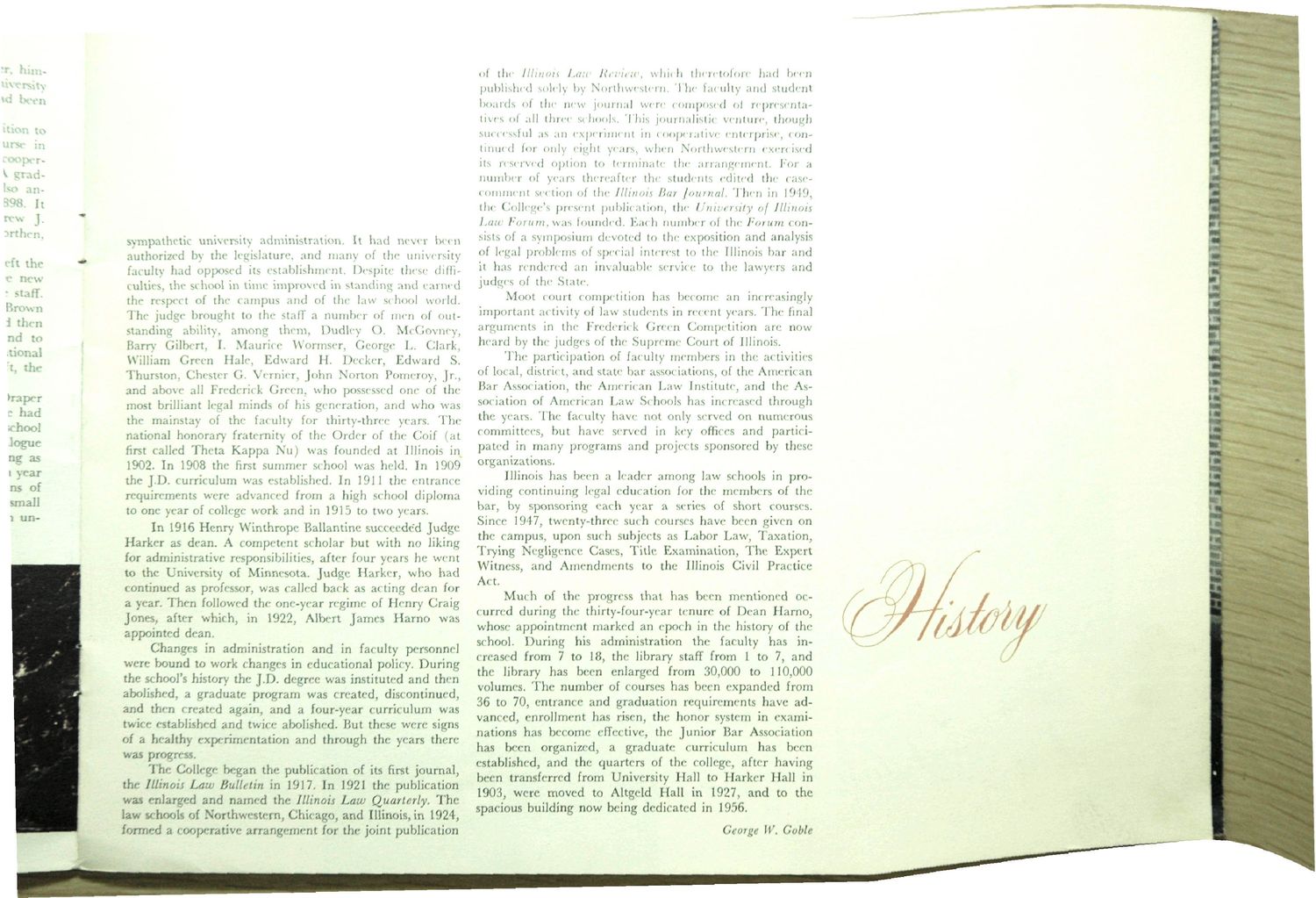 sympathetic university administration. It had never been authorized by the legislature, and many of the university faculty had opposed its establishment. Despite these difficulties, the school in time improved in standing and earned the respect of the campus and of the law school world. The judge brought to the staff a number of men of outstanding ability, among them, Dudley O. McGovncy, Barry Gilbert, I. Maurice Wormser, George L. Clark, William Green Hale, Edward H. Decker, Edward S. Thurston, Chester G. Vernier, John Norton Pomeroy, Jr., and above ali Frederick Green, who possessed one of the most brilliant legal minds of his generation, and who was the mainstay of the faculty for thirty-three years. The national honorary fraternity of the Order of the Coif (at first called Theta Kappa Nu) was founded at Illinois in 1902. In 1908 the first summer school was held. In 1909 the J.D. curriculum was established. In 1911 the entrance requirements were advanced from a high school diploma to one year of college work and in 1915 to two years. In 1916 Henry Winthrope Ballantine succeeded Judge Harker as dean. A competent scholar but with no liking for administrative responsibilities, after four years he went to the University of Minnesota. Judge Harker, who had continued as professor, was called back as acting dean for a year. Then followed the one-year regime of Henry Craig Jones, after which, in 1922, Albert James Harno was appointed dean. Changes in administration and in faculty personnel were bound to work changes in educational policy. During the school's history the J.D. degree was instituted and then abolished, a graduate program was created, discontinued, and then created again, and a four-year curriculum was twice established and twice abolished. But these were signs oi a healthy experimentation and through the years there was progress. The College began the publication of its first journal, the Illinois Low Bulletin in 1917, In 1921 the publication was enlarged and named the Illinois Law Quarterly. The law schools of Northwestern, Chicago, and Illinois, in 1924, formed a cooperative arrangement for the joint publication of the Illinois Law Review, which theretofore had been published solely by Northwestern. The faculty and student boards of the new journal were composed of representatives of all three schools. This journalistic venture, though successful as an experiment in cooperative enterprise, continued for only eight years, when Northwestern exercised its reserved option to terminate the arrangement. For a number of years thereafter the students edited the casecomment section of the Illinois Bar Journal. Then in 1949, the College's present publication, the University of Illinois Law Forum, was founded. Each number of the Forum consists of a symposium devoted to the exposition and analysis of legal problems of special interest to the Illinois bar and it has rendered an invaluable service to the lawyers and judges of the State. Moot court competition has become an increasingly important activity of law students in recent years. The final arguments in the Frederick Green Competition are now heard by the judges of the Supreme Court of Illinois. The participation of faculty members in the activities of local, district, and state bar associations, of the American Bar Association, the American Law Institute, and the Association of American Law Schools has increased through the years. The faculty have not only served on numerous committees, but have served in key offices and participated in many programs and projects sponsored by these organizations. Illinois has been a leader among law schools in providing continuing legal education for the members of the bar, by sponsoring each year a series of short courses. Since 1947, twenty-three such courses have been given on the campus, upon such subjects as Labor Law, Taxation, Trying Negligence Cases, Title Examination, The Expert Witness, and Amendments to the Illinois Civil Practice Act. Much of the progress that has been mentioned occurred during the thirty-four-year tenure of Dean Harno, whose appointment marked an epoch in the history of the school. During his administration the faculty has increased from 7 to 18, the library staff from 1 to 7, and the library has been enlarged from 30,000 to 110,000 volumes. The number of courses has been expanded from 36 to 70, entrance and graduation requirements have advanced, enrollment has risen, the honor system in examinations has become effective, the Junior Bar Association has been organized, a graduate curriculum has been established, and the quarters of the colleget after having been transferred from University Hall to Harker Hall in 1903, were moved to Altgeld Hall in 1927, and to the spacious building now being dedicated in 1956. George W, Coble